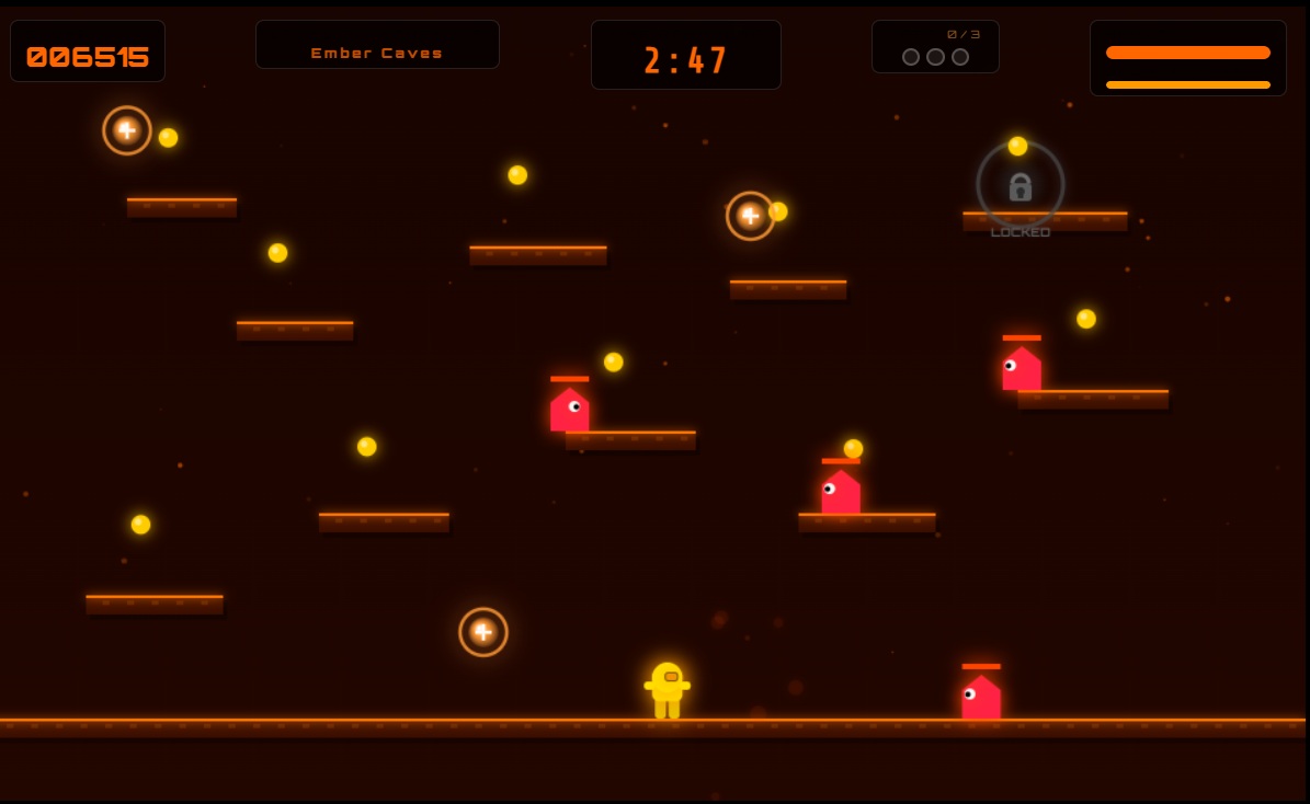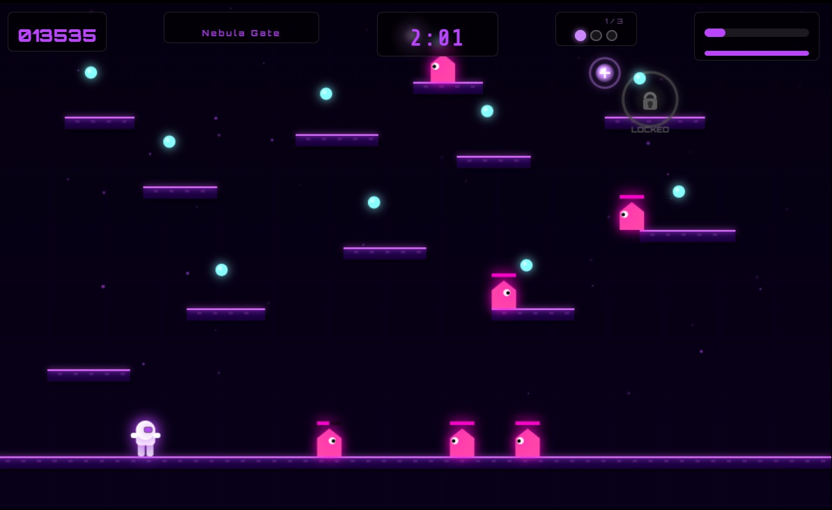 Boy Gasul is a fast-paced neon action platformer set across 3 distinct worlds, each split into 3 stages — 9 stages total of increasing challenge. You play as a glowing armored hero navigating floating platforms, battling angular enemies, and hunting down every health orb before the clock runs out.